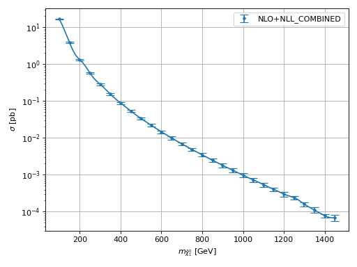 >>> import urllib.request >>> import hepi >>> dl = hepi.load(urllib.request.urlopen( ... "https://raw.githubusercontent.com/fuenfundachtzig/xsec/master/json/pp13_hino_NLO%2BNLL.json" ... )) >>> hepi.plot(dl,"N1","NLO_PLUS_NLL_COMBINED",xaxis="$m_{\\tilde{\\chi}_1^0}$ [GeV]")