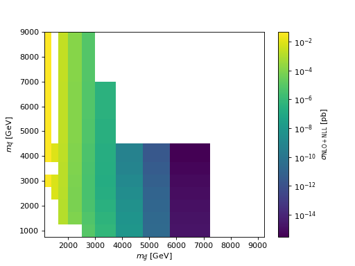 - hepi.plot.mass_mapplot(dict_list, part1, part2, z, logz=True, zaxis='$\\sigma$ [pb]', zscale=1.0, label=None)[source]